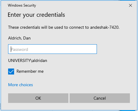Press Enter to start RDP. Keep in mind that if you are off campus, VPN connection is required before you use Remote Desktop.