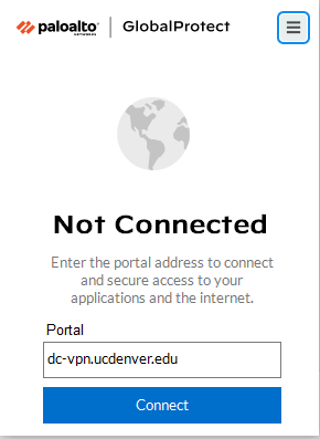 - Once you have opened the GlobalProtect client, click Connect button, or enter your primary campus VPN portal, if it is not present: