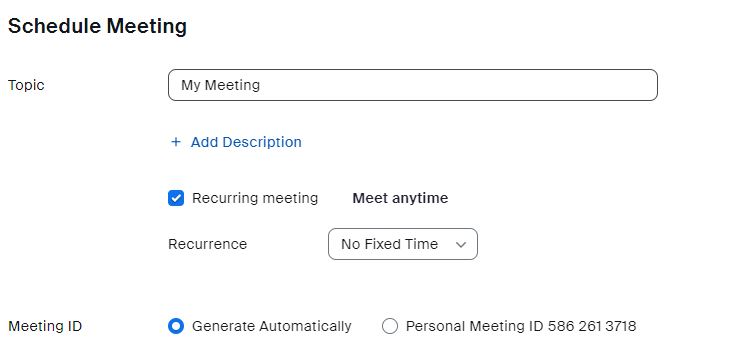 4. Click the Recurring Meeting checkbox. Under Recurrence, select No Fixed Time. This makes the meeting available in perpetuity. No limits. Use it at-will.
